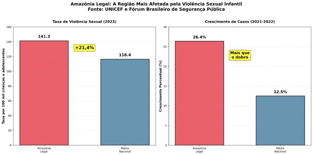 Quanto à distribuição geográfica, a Amazônia Legal emerge como a região mais crítica do país, com taxas de violência sexual infantil 21,4% superiores à média nacional e crescimento mais que o dobro do observado no restante do Brasil. Seis dos dez estados com maiores taxas estão na Amazônia Legal, com Rondônia liderando o ranking nacional. A situação é particularmente grave para crianças e adolescentes negros e indígenas, que representam 81% das vítimas na região.