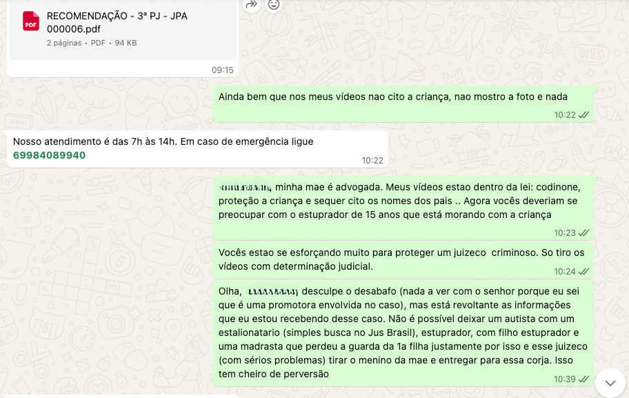 Cabe esclarecer que a promotora citada é a responsável por impedir a convivência da mãe com a criança por 160 dias mesmo sabendo dos atos libidinosos aos quais o menino é submetido.