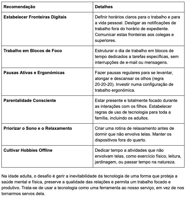 Nesta fase de autonomia, a responsabilidade recai largamente sobre o próprio indivíduo para cultivar hábitos digitais saudáveis, embora as instituições de ensino e os empregadores também possam desempenhar um papel de apoio.