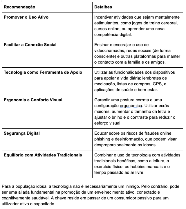 As recomendações para os idosos focam-se em maximizar os benefícios cognitivos e sociais da tecnologia, enquanto se minimizam os riscos físicos.