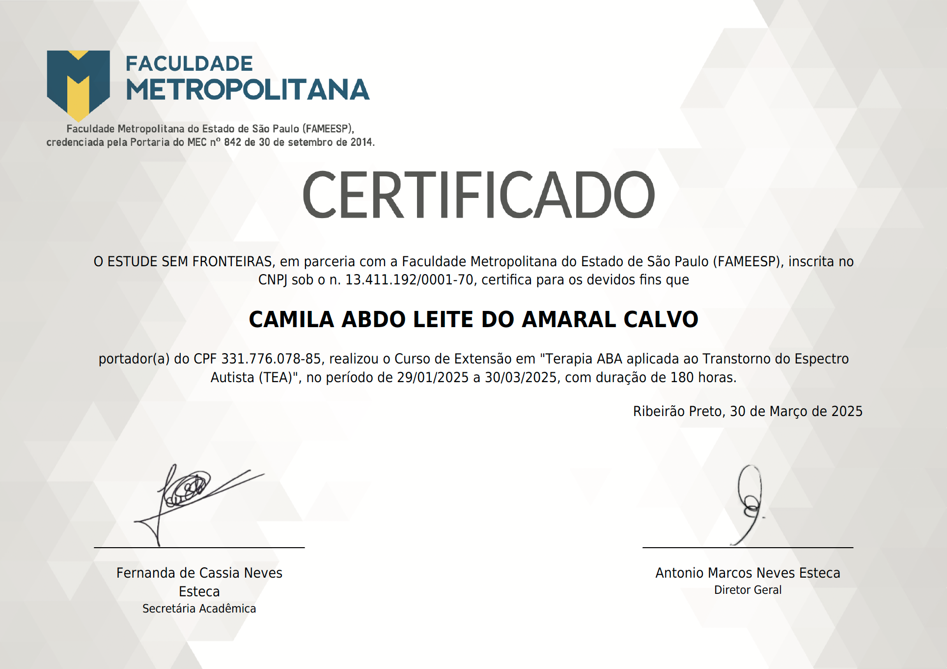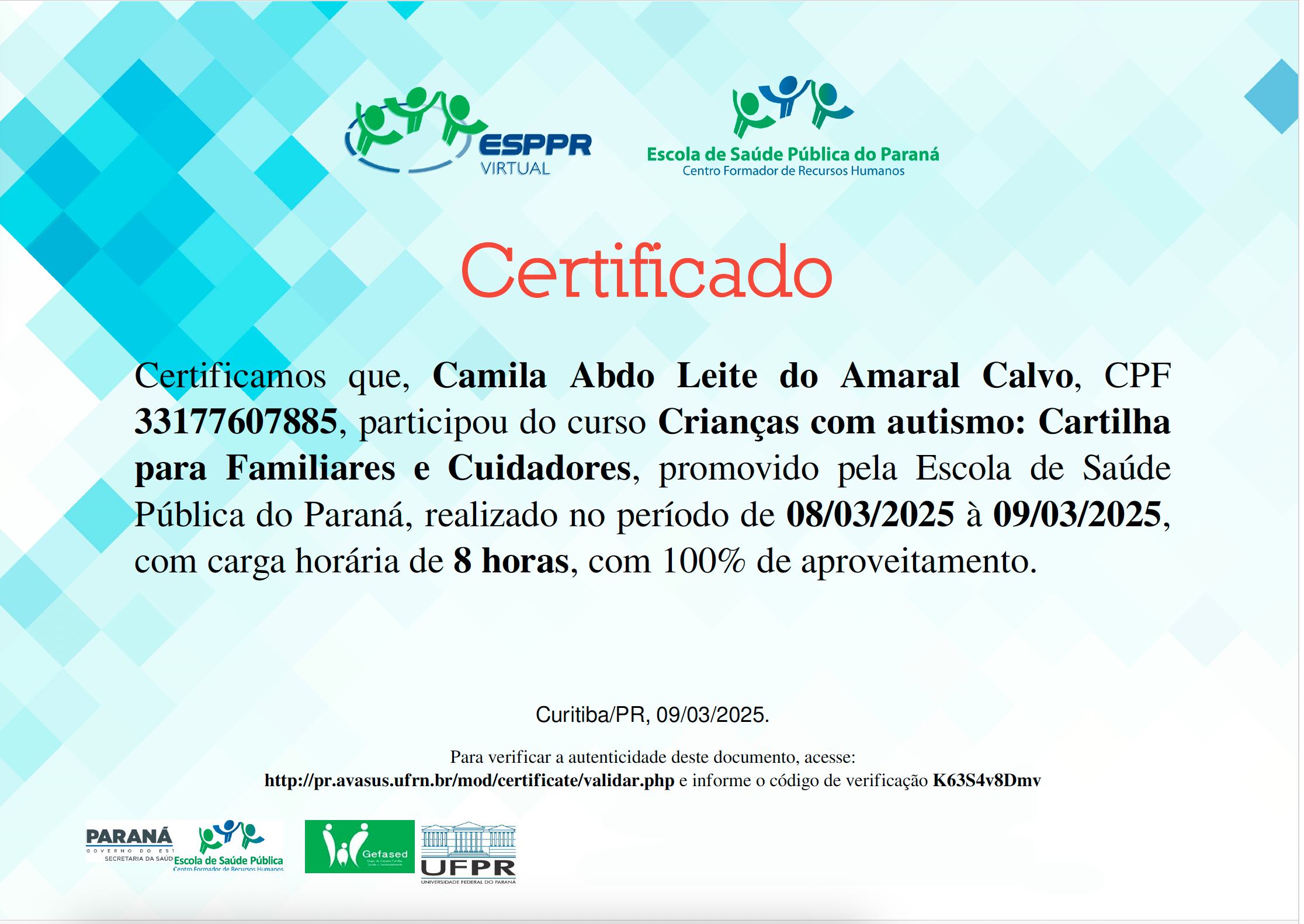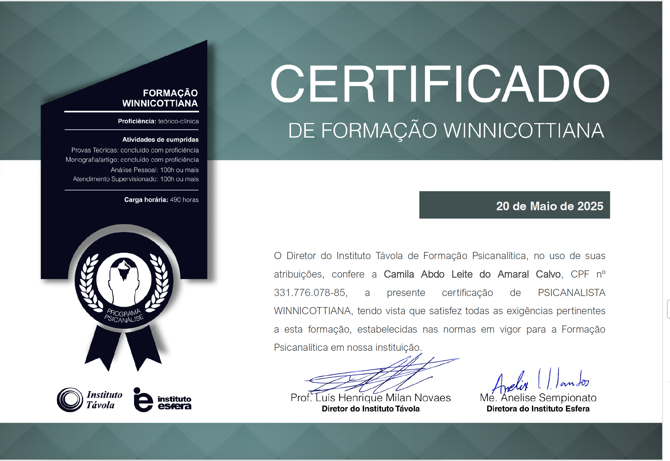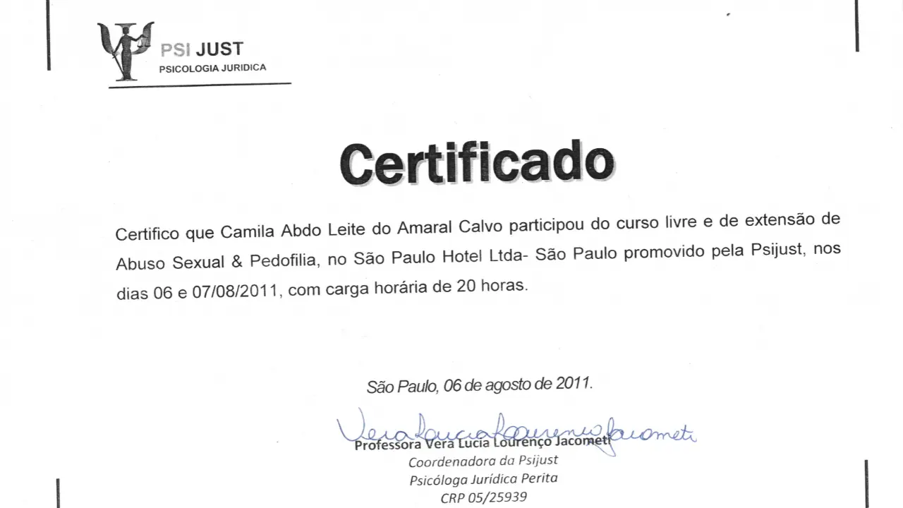 Ademais sou analista do comportamento para aplicador em ABA, com capacitação para reconhecimento, diagnóstico e intervenção do Transtorno do Espectro Autista, psicóloga analítica especialista em Jung e psicanalista em clínica infantil na teoria de Winnicott.