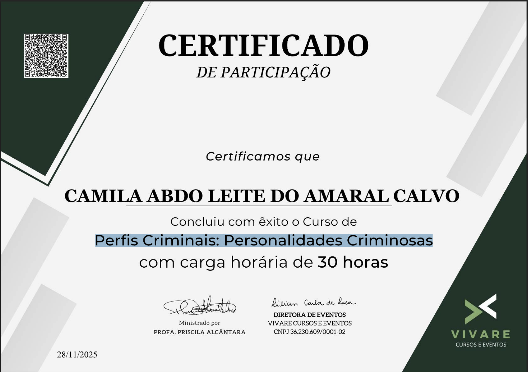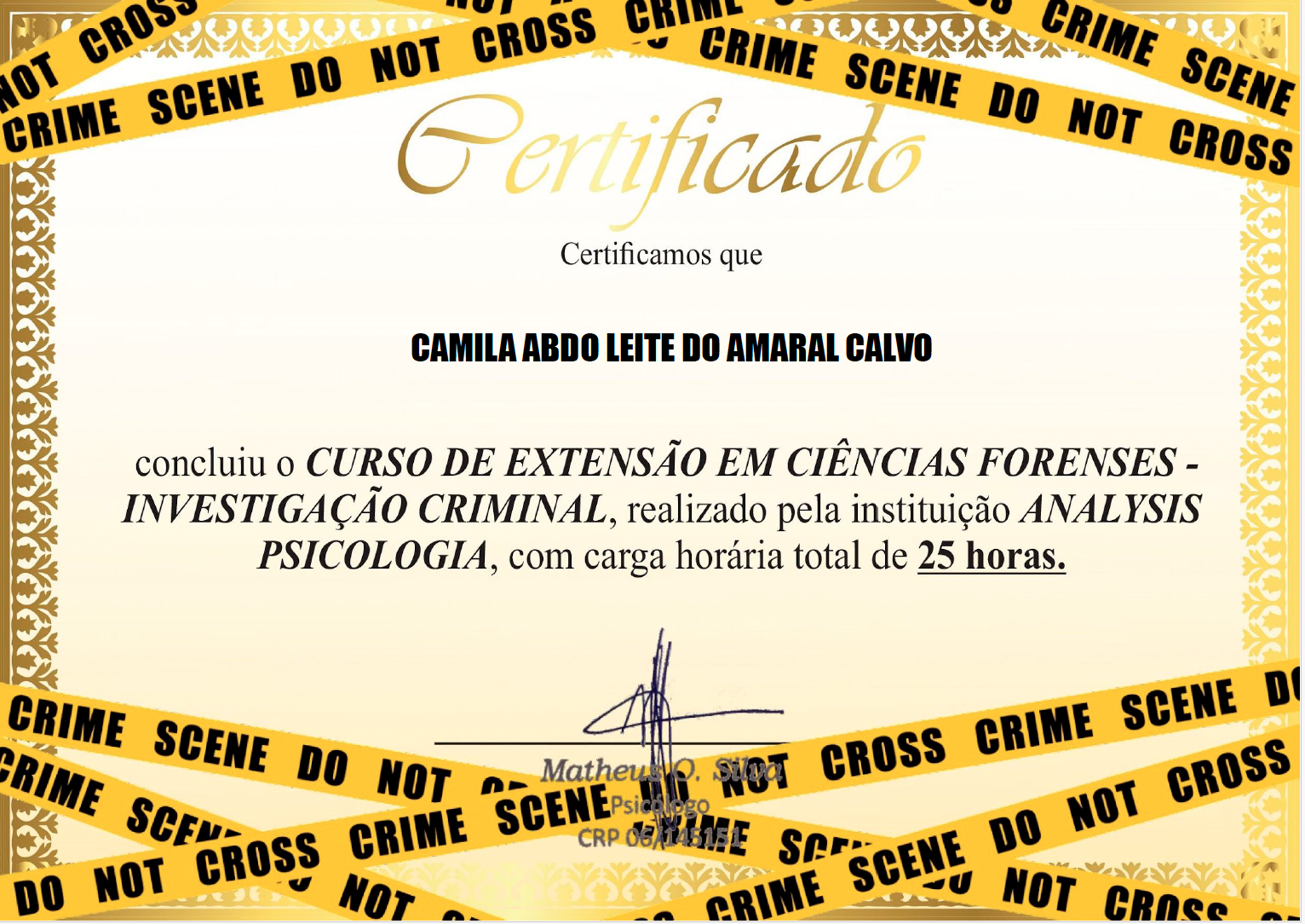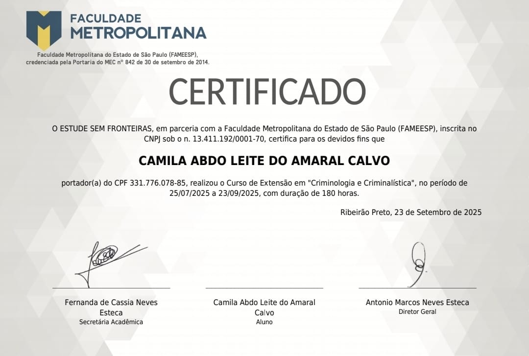 Formanda em criminologia, também sou especializada em Ciências Forenses – Investigação Criminal, Psicopatologia Forense – transtornos mentais e crimes, crimes sexuais e Psicológia Jurídica.
