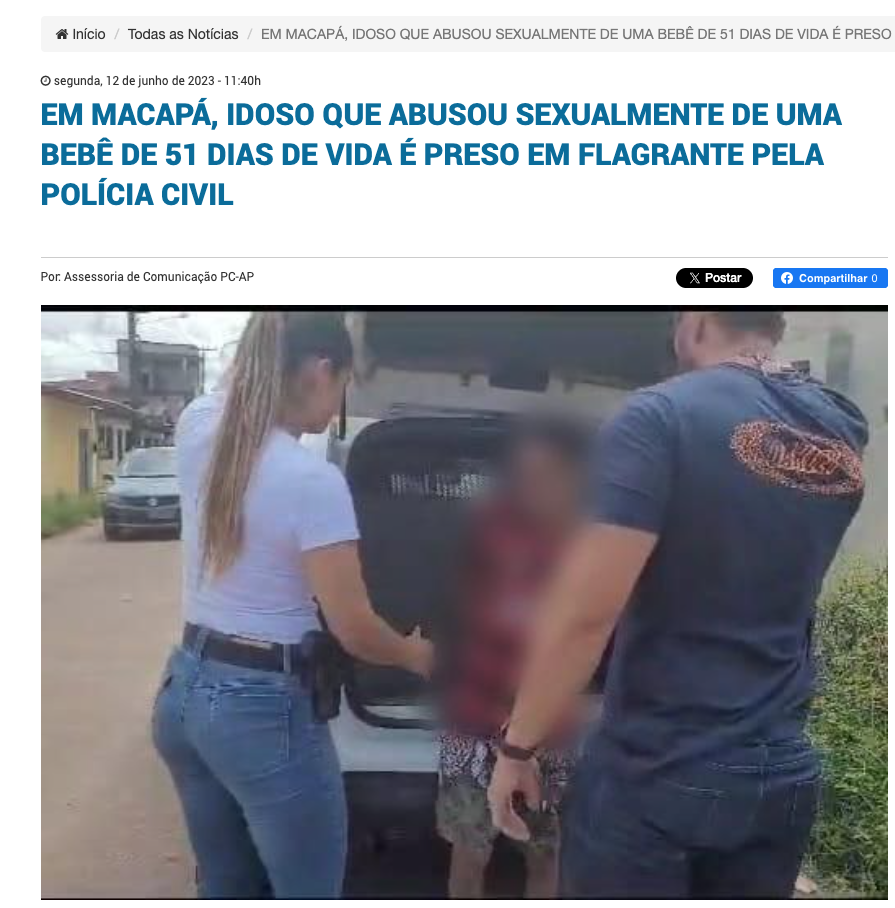 Em junho de 2023, um bebê de somente 51 dias foi abusado sexualmente pelo próprio avô, de 71 anos. Ele foi preso em flagrante pela Polícia Civil.